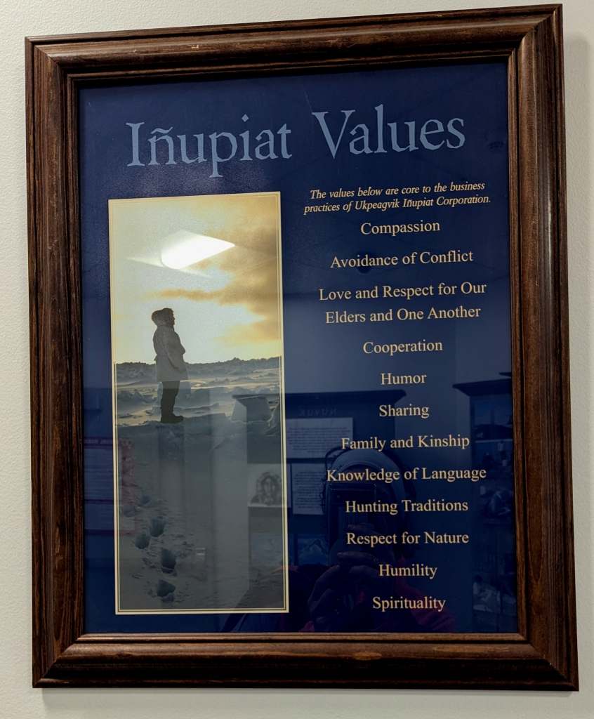 During my time here, I’ve also learned about the Iñupiat people, the Indigenous community of this region, and the values they hold. These values –respect for nature, cooperation, sharing, respect for elders and one another, love for children, knowledge of language and culture, hard work, humility, avoidance of conflict, humor, responsibility to the community, and patience -are displayed proudly in public spaces. And I see them echoed everywhere: in our fieldwork, in our group dynamics, and in the way this community lives in relationship with the land.